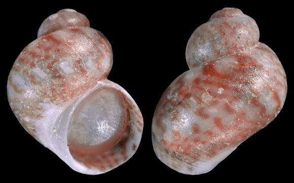 | Eastern Lusitanian Seamounts (possibly Pleistocene population). Another possible population lives isolated near Peniche, W. Portugal. And finally Gibraltar Strait. Lives among photophilous in the infralittoral. Grazer. « Shell: reaching 2 x 1.8 mm, with 3.5 whorls, low spired with ample body whorl. Protoconch ca. 1 whorl, with faint, irregular, more or less anastomosing raised threads fading towards the distal part. Surface of teleoconch whorls apparently smooth under the stereomicroscope, showing a shagreened surface with irregular, very small punctures under SEM. Body whorl with faint spiral microsculpture around the umbilical area. Umbilicus narrow and deep, bordered by a sharp, white keel, fluted internally. Shell colour: protoconch opaque white. » – S. Gofas: “Notes on some Ibero-Moroccan and Mediterranean Tricolia with description of new species”, Journal of Molluscan Studies (1993), 59, p.353. On algae at low tide, Algeciras, Andalucia, S. Spain. 2,2mm. |