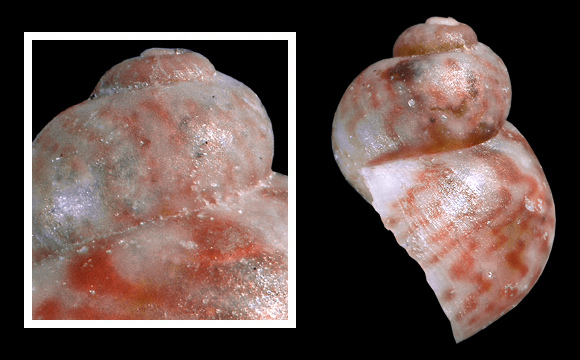 « Colour pattern of teleoconch whorls with pink lines on a translucent background and opaque white areas. Pink lines arranged more or less parallel to the growth lines on early whorls, on the body whorl more or less disrupted and clustered to form a series of subsutural patches. A white surface with wavy contour around the umbilicus, and often also along the suture of the body whorl; a series of smaller opaque white patches on the periphery of the body whorl. » |