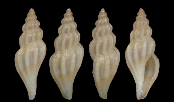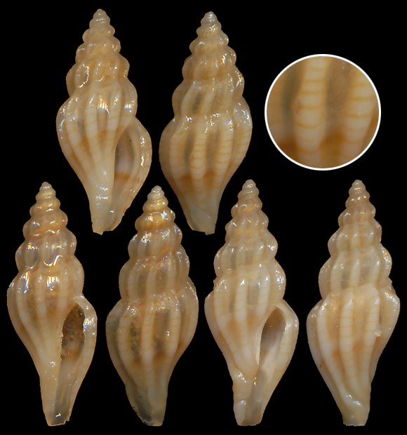The costae, quite prominent, are separated by large and deep furrows. The slender shape, the pale background, the fine brown lines, the absence of spiral sculpture, are significant elements. Sometimes a dark spiral band turns around the base of the last whorl, like in M. attenuata, but the colour is less pronounced. – 30m deep, on detritic bottom, Málaga. 6-6,5mm. |